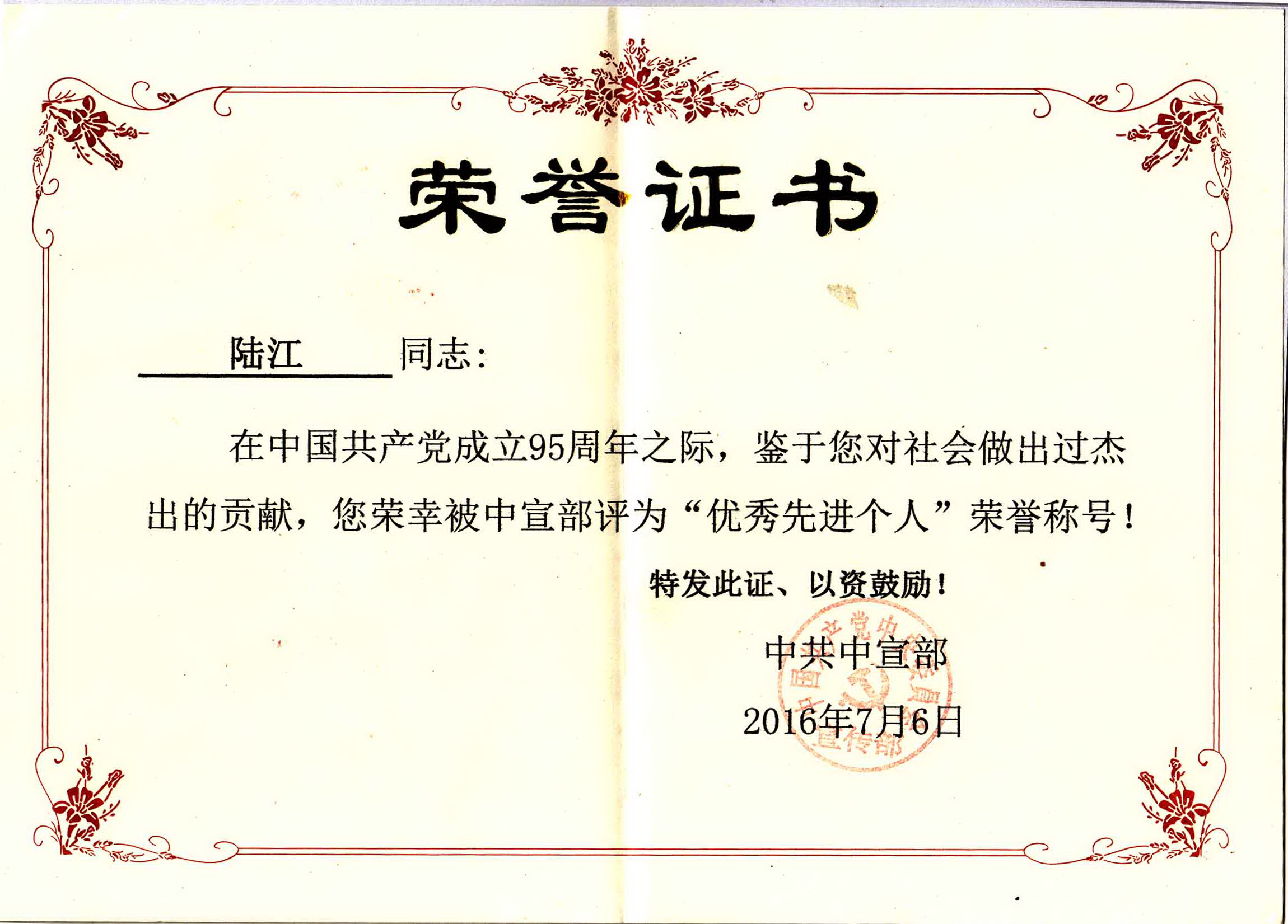 陸江獲得中國醫學??茖2炐銓<沂褎e貢獻獎
